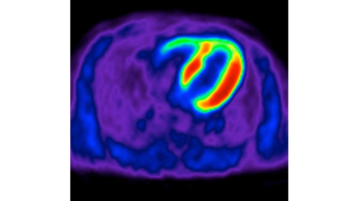 Transaxial view of a viability F-18 fluorodeoxyglucose (FDG) positron emission tomography (PET) study through the heart