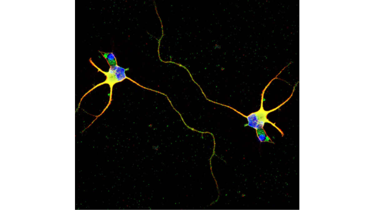 Single immature neuron under mirror transformation. Immunolabeling against Tau protein (red) and multivesicular bodies (green). Cell nuclei are labelled with DAPI (blue)