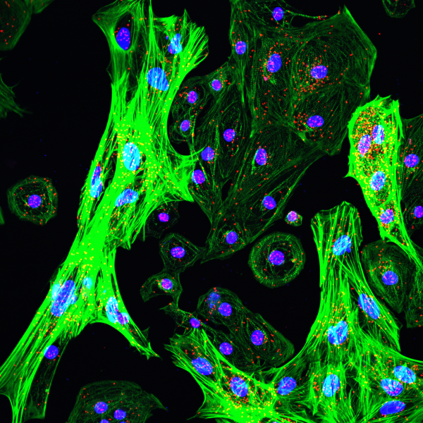 "Hela cells overexpressing the thyroid hormone receptor isoform TR Beta (red). Nuclei are labelled with DAPI (blue) and actin filaments are stained with Alexa Fluor 488 Phalloidin (green). (Confocal microscopy)