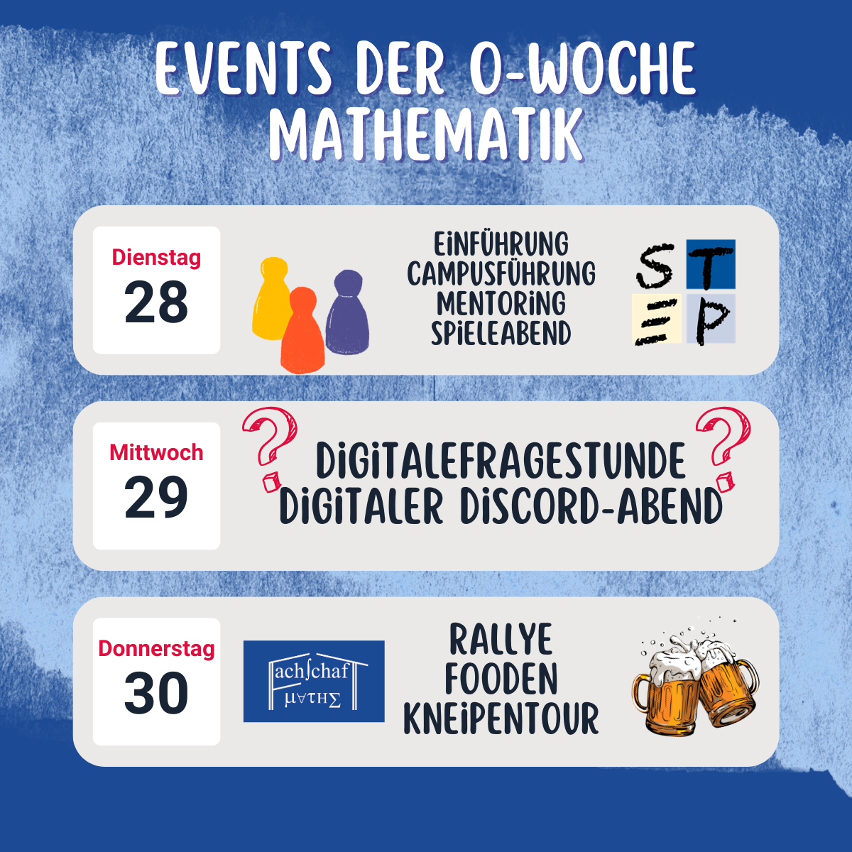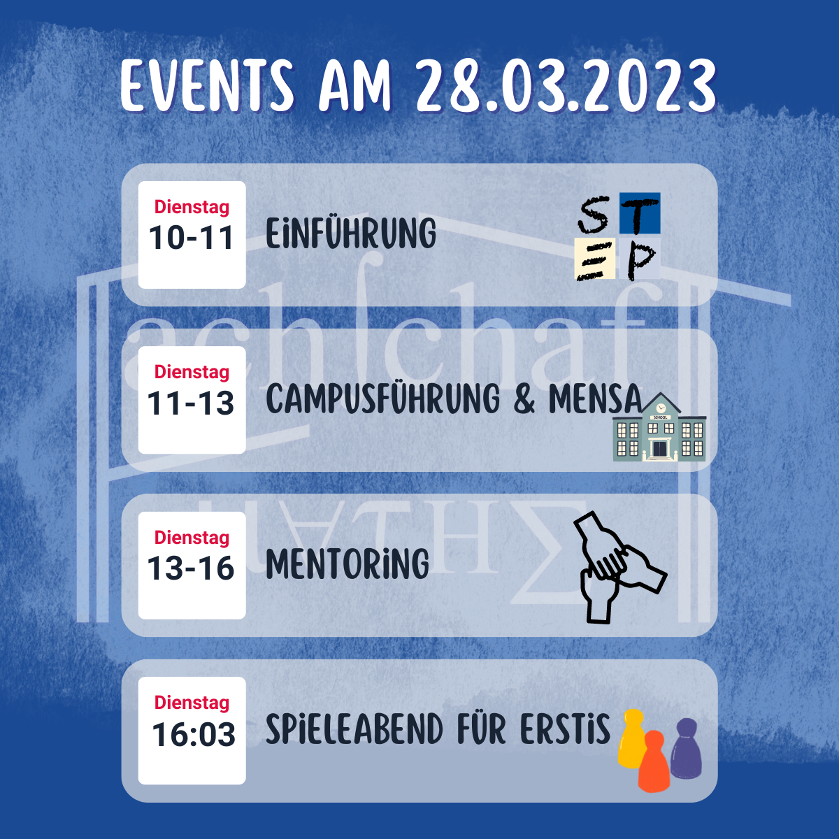 Am Dienstag erhaltet ihr zahlreiche Informationen über die Universität. In der Einführungsveranstaltung im Raum S07 S00 D07 (am Hauptcampus!) stellt sich die Mathe-Fakultät vor, im Anschluss gibt's eine kleine Führung über den Campus samt Abstecher in die Mensa.