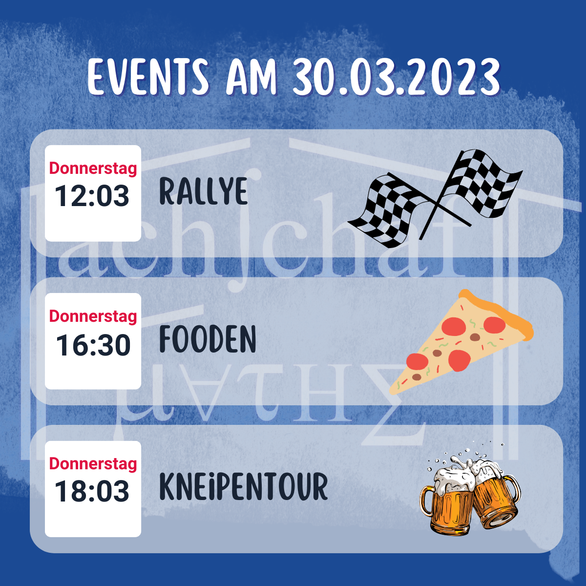 Nach lauter informativen Tagen steht der Donnerstag dann eher im Zeichen vom Spaß. In einer kleinen Rallye lernt ihr ab 12:03 Uhr (Treffpunkt: LuDi, WSC-W-2.20) das WSC, unser Mathegebäude, besser kennen.