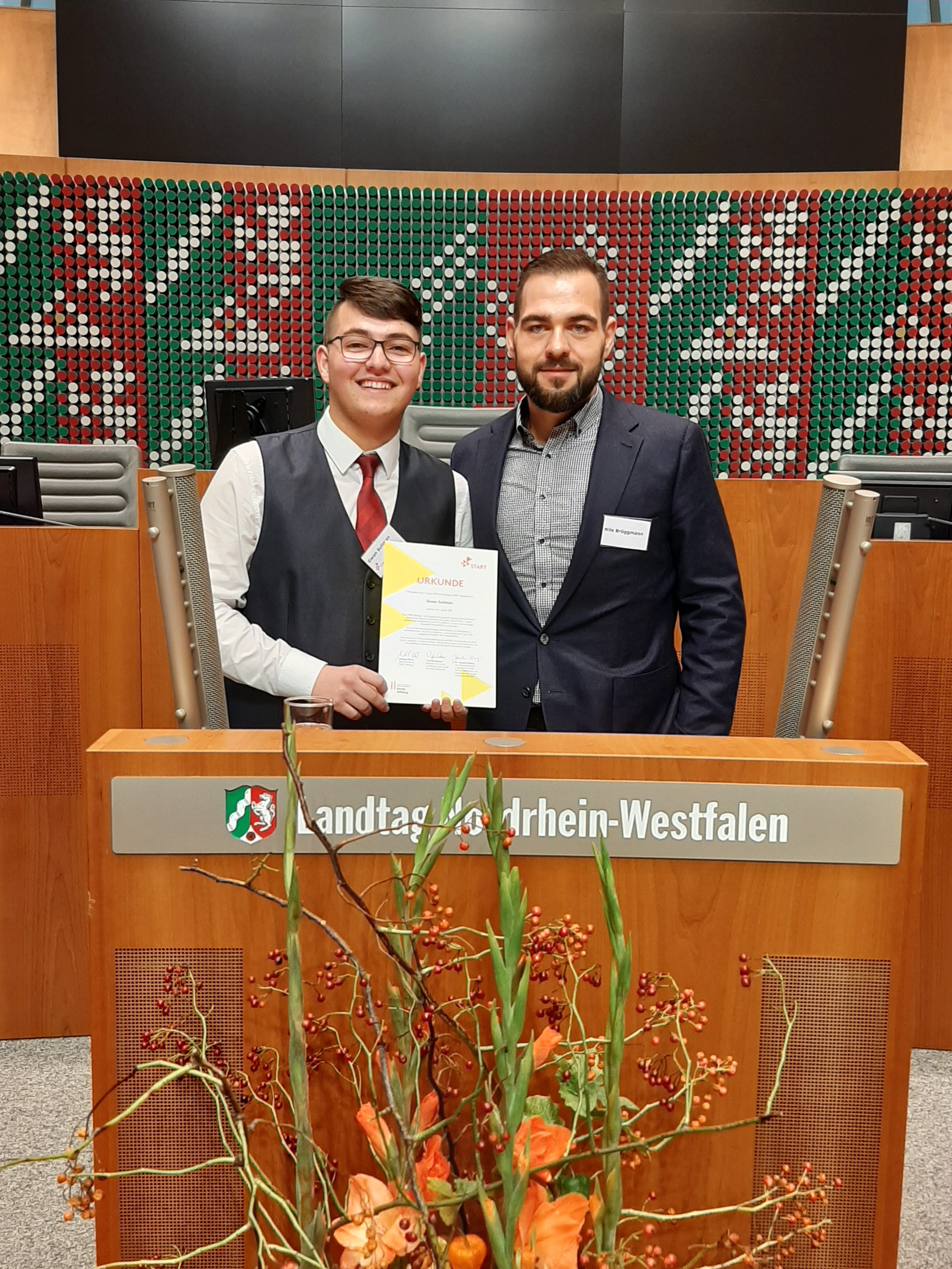 Kurz vor den Herbstferien wurde unser Förderschüler Gwan Suliman als einer von 28 neuen Stipendiatinnen und Stipendiaten der START-Stiftung im Plenarsaal des Düsseldorfer Landtags begrüßt. Unter dem Motto "Aus Talenten werden Macher" werden sie über drei Jahre hinweg in ihrer persönlichen Entwicklung gefördert und begleitet. Alle Stipendiatinnen und Stipendiaten zeichnen sich nicht nur durch ihre herausragenden Leistungen, sondern auch durch ihr gesellschaftliches Engagement aus. Während der feierlichen Verleihung überreichte Herr Dr. Joachim Stamp, Minister für Kinder, Familie, Flüchtlinge und Integration sowie stellvertretender Ministerpräsident, den glücklichen Stipendiatinnen und Stipendiaten ihre Urkunden. Unser Förderlehrer Nils Brüggmann war als geladener Gast mit dabei und konnte Gwan zur Aufnahme im Namen des Förderunterrichts herzlich gratulieren.