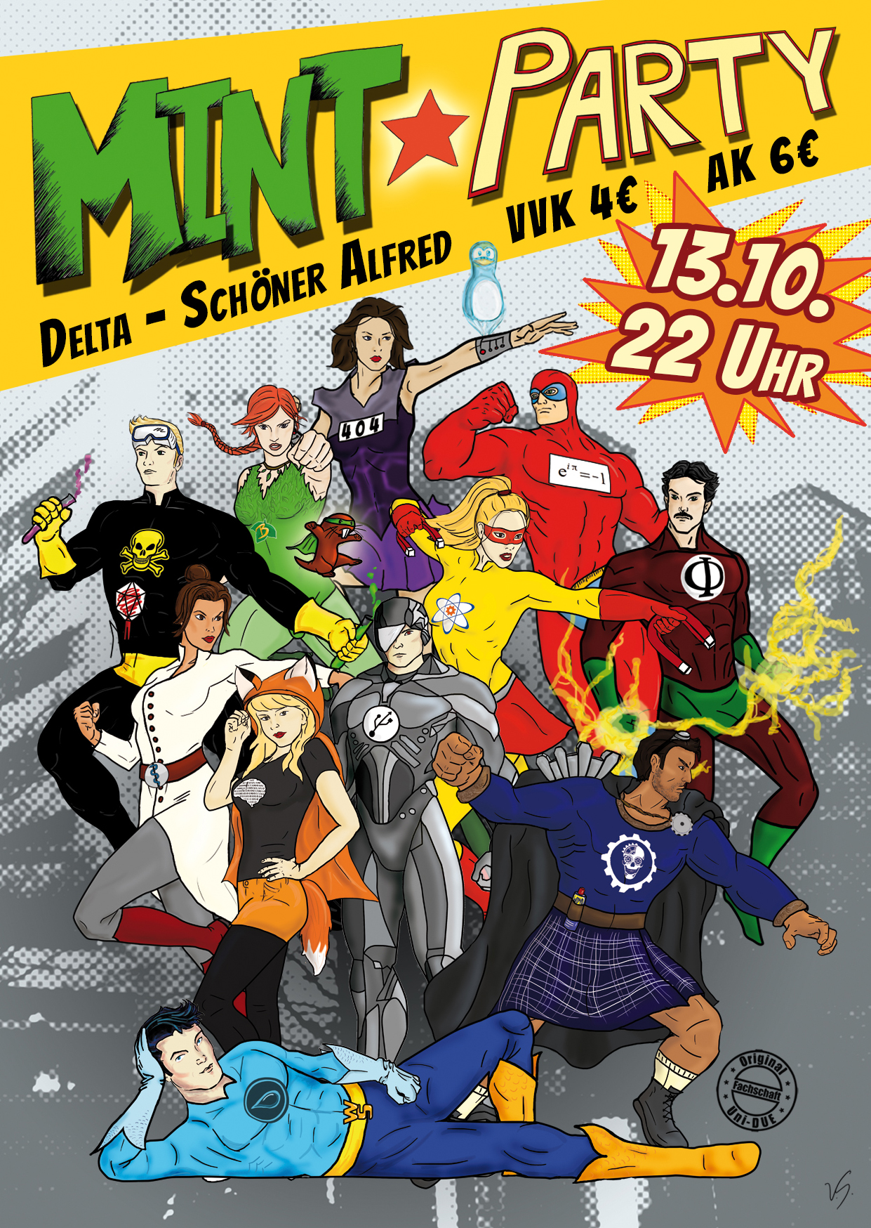 Am 13.10.17 findet zum sechsten mal die MINT-Party im Delta Musik Park Essen statt. Zusammen mit 10 anderen Fachschaften aus dem MINT-Sektor fliegen wir mit euch heldenhaft durch die Nacht und erleben wundervolle Abenteuer. Vier Floors, eine Spielehalle und viele Überraschungen inklusive! Freut euch auf eine besondere Nacht und lernt tolle neue Menschen kennen!