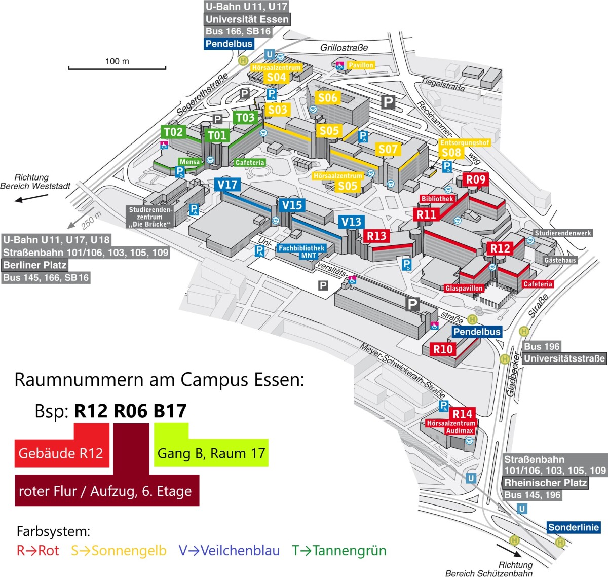Der erste Block der Raumnummern bezeichnet das Gebäude und setzt sich aus der Farbe und der Hausnummer des Gebäudes zusammen. Beispielsweise ist das R12 das rote Gebäude mit der Nummer 12.