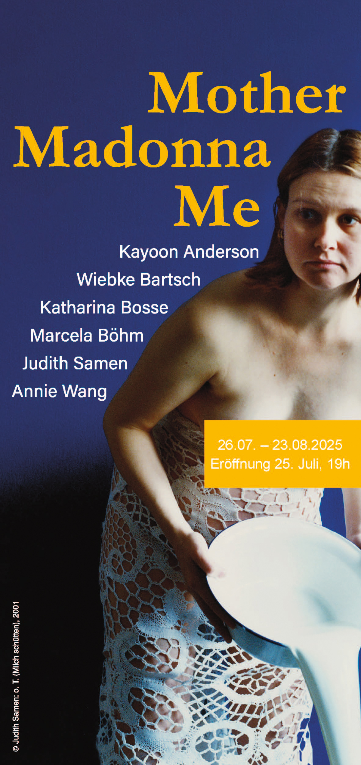 Mother Madonna Me zeigt Arbeiten von Kayoon Anderson, Wiebke Bartsch, Marcela Böhm, Katharina Bosse, Judith Samen und Annie Wang. Sie widmet sich einem hochaktuellen Thema, in dem das Persönliche untrennbar mit dem Politischen verwoben ist: dem Muttersein. In Skulpturen, Malerei, Fotografien und textilen Arbeiten setzen sich die sechs renommierten Künstlerinnen mit kulturellen Vorstellungen und historischen Prägungen von Mutterschaft auseinander, hinterfragen tradierte Mutterbilder, reflektieren ihre eigenen Erfahrungen mit Mütterlichkeit und entwickeln neue visuelle Konzepte zum Themenkomplex. Der Bogen reicht von idealisierten Darstellungen wie der Madonna über stereotype Figurationen von „Rabenmüttern“ bis hin zu Werken, die das körperliche Erleben und die Beziehung zwischen Mutter und Kind thematisieren.