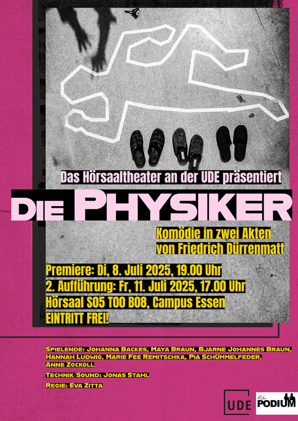 Das Hörsaaltheater, die Theatergruppe der Germanistik, bringt in diesem Semester "Die Physiker" von Friedrich Dürrenmatt auf die Bühne. Premiere ist am 8.7.2025 um 19.00 Uhr. Die zweite Vorstellung findet am 11.7.2025 um 17.00 Uhr statt. Ort: Hörsaal S05 T00 B08.
