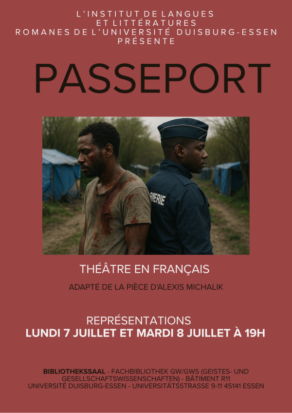 Am Montag, 7. Juli 2025 und Dienstag, 8. Juli 2025, präsentieren Studierende der Veranstaltung "Communication orale" unter der Leitung von Dr. Isabelle Vacher und Esther Vissac die Theateraufführung "Passeport" (Alexis Michalik).