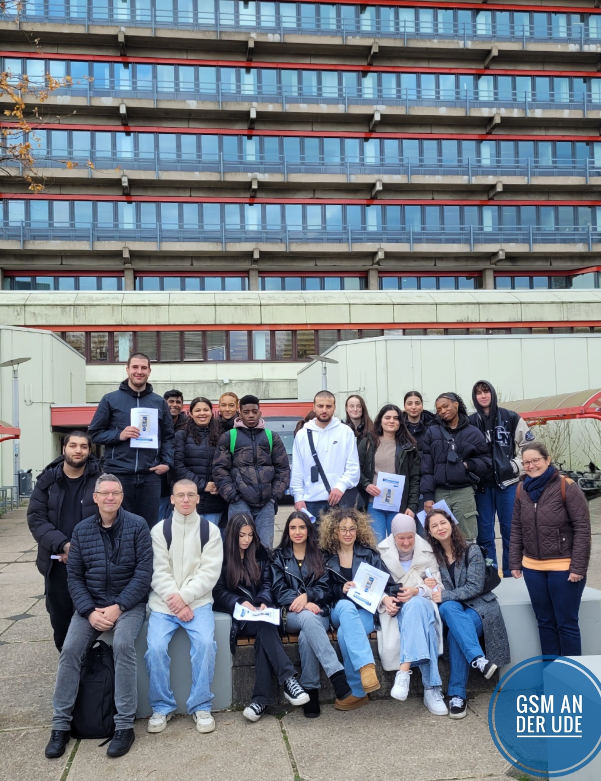 Auch dieses Mal war das unmittelbare Feedback der Schüler*innen durchweg erfreulich, und bei einigen steht der Studienwunsch jetzt offenbar schon fest. Tatsächlich begegneten uns während der Aufnahme für das Gruppenbild zur Mittagszeit immer wieder ehemalige Mitschüler*innen der Gesamtschule Duisburg-Meiderich, die inzwischen erfolgreich an der UDE studieren – Grund zur Freude, auch für Mareike Pees und Andreas Robusch von der GSM, beide Alumni der UDE, die den Besuch ihrer Schüler*innen am Dienstag begleitet haben.