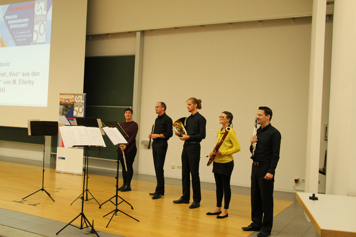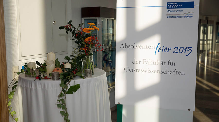 Am 24.11.2014 fand die feierliche Verabschiedung unserer diesjährigen AbsolventInnen statt. Wegen der großen Gästezahl hatte die Veranstaltung kurzfristig ins Essener Haus der Technik verlegt werden müssen, wo der Festakt im großen Hörsaal einen würdigen Rahmen fand. In ihren Begrüßungs-Reden betonten der Dekan, Prof. Dr. Dirk Hartmann, und Dr. Britta Caspers, Alumni-Referentin der Fakultät, den Bildungswert eines geisteswissenschaftlichen Studiums. Sie ermutigten die frischgebackenen BAs, MAs, Magister und Doktoren, den von ihnen gewählten Weg mit Mut und Zuversicht weiterzugehen, ganz gleich, ob er sie nun ins Berufsleben oder in die wissenschaftliche Weiterqualifikation führt, und luden sie ein, der Fakultät verbunden zu bleiben. Musikalisch umrahmt wurde der Festakt in diesem Jahr vom Ensemble R11 T04: Mit traditionellen Tunes auf Whistles, Pipes und Gitarren holten Prof. Dr. Christoph Heyl, Prof. Dr. Frank Erik Pointner und Alan Webb ein Stückchen Schottland in den Saal.