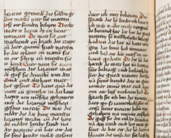 Ist es überhaupt nötig, das Original zu behelligen, wenn hochauflösende Fotos von der Bibliothek ins Netz gestellt wurden? Dafür machte der Seminarleiter, Prof. Dr. Martin Schubert, vor Ort vor allem zwei Gründe geltend. Zum einen verspürt man hier die Aura des Historischen: Dies ist ebendas Buch, vor dem ein braver Mönch im Kloster Marienfrede bei Xanten in den 1470er Jahren gesessen hat und das seit über 500 Jahren verwahrt wird, bis wir zu Besuch kommen. Die materiale Gestalt, vom hölzernen Buchdeckel mit Lederbezug über die ledernen Daumenregister bis zum Geruch des Papiers, lässt sich nicht in einer technischen Reproduktion erfassen. Zum anderen wurde der Besuch zur Autopsie genutzt, also zur Überprüfung von Lesarten im Original. An ein paar Stellen musste doch noch einmal in die Handschrift gesehen werden. Was steht eigentlich in Mikroschrift am rechten Rand ergänzt? Mit den korrekten Lesungen versehen, konnten wir zufrieden heimfahren. Besonders hat uns die freundliche Aufnahme durch die Mitarbeiter der ULB und die Leitung des Handschriftenlesesaals beeindruckt, die uns die Gelegenheit gaben, anderthalb Stunden lang intensiv an dem alten Original zu arbeiten.
