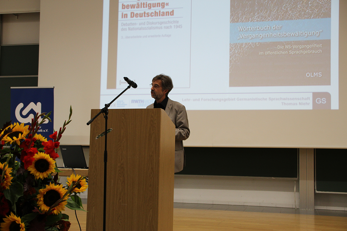 Nach der Begrüßung durch den Dekan der Fakultät für Geisteswissenschaften, Prof. Dirk Hartmann, und einer Einführung durch den Historiker Prof. Wilfried Loth, der sein Wirken als „Public Historian“ und als Lehrender würdigte, sprach Grütter in dem bis auf den letzten Platz besetzten Hörsaal über die Vermittlung von Geschichte in Museumsausstellungen. Anhand beeindruckender Bilder aus dem Ruhr Museum zeigte dessen Direktor, was eine Ausstellung der dinglichen Überlieferung leisten kann.