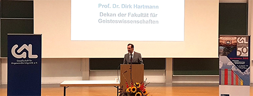 Begrüßt wurden die Gäste vom Prodekan unserer Fakultät, Prof. Dr. Volker Steinkamp, Heinz Eickmans, Dr. Veronika Wenzel (Vorsitzende der Fachvereinigung Niederländisch), Prof. Dr. Hans Bennis (Generalsekretär der Nederlandse Taalunie) und Prof. Dr. Paul Sars (Botschafter der Euregio Rhein-Waal), der auch den ersten Plenumsvortrag hielt. Darin gab er eine „Oriëntatie op de Duits-Nederlandse Euregio“.