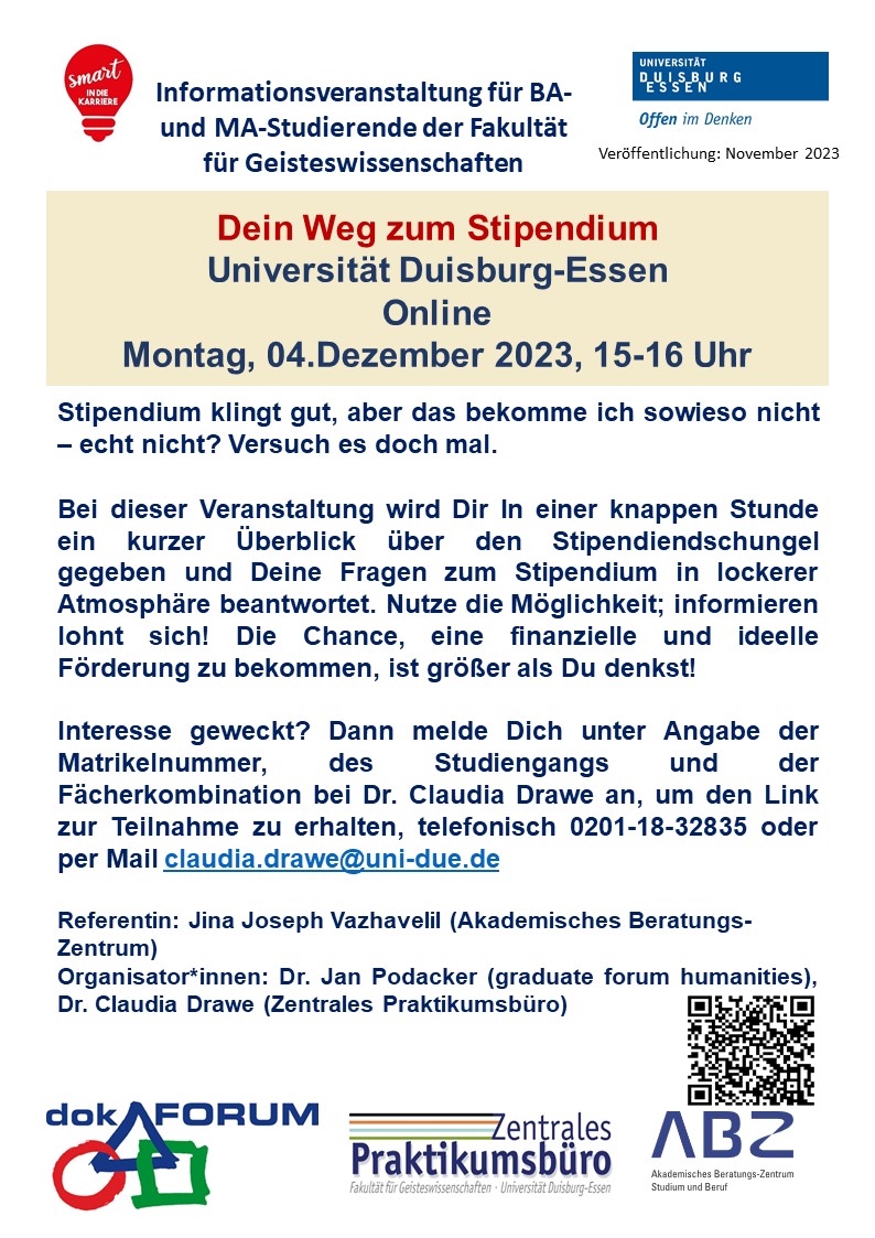 Zur optimalen Vorbereitung bieten wir zusätzlich am 09.12.2025 einen Workshop zum Thema „Wie finde ich mein passendes Förderungswerk?“ an. Interessierte können sich noch unter folgendem Link anmelden: https://www.uni-due.de/abz/stipendien/skr_foerderungswerk.php
