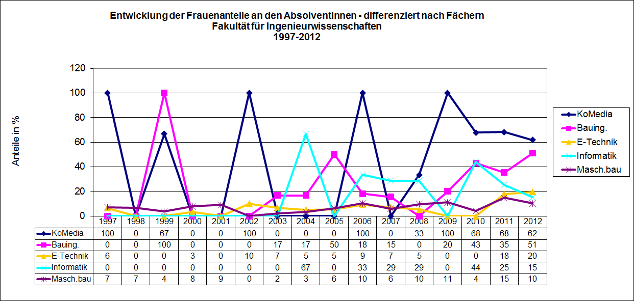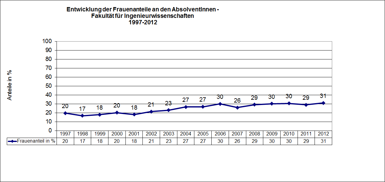 Seit 2002 ist ein stetiger Anstieg der Absoventinnenzahlen zu verzeichnen. Sie liegen seitdem bei deutlich über 20% bzw. teilweise bei 30% (2006, 2009 und 2010). In 2012 ist der Anteil um einen weiteren Prozentpunkt geklettert. Zu beachten ist in dieser Fakultät jedoch die Umstrukturierung einzelner Fächer und die Verlagerung der Psychologie von den Bildungs- zu den Ingenieurwissenschaften im Zeitraum der Fusion 2003.