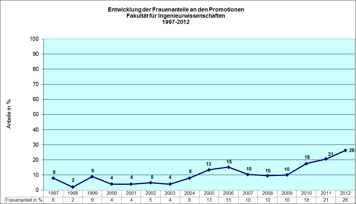 Wie hoch ist der durchschnittliche Frauenanteil an den Promotionen? Für die UDE ist der Zeitraum ab 2003 von Relevanz, da hier die Universitäten-Gesamthochschulen Duisburg und Essen fusionierten und daher erst ab diesem Zeitraum von einer Hochschule gesprochen werden kann. In dieser Fakultät lag der Frauenanteil von 2003 bis 2012 bei durchschnittlich bei 10%.