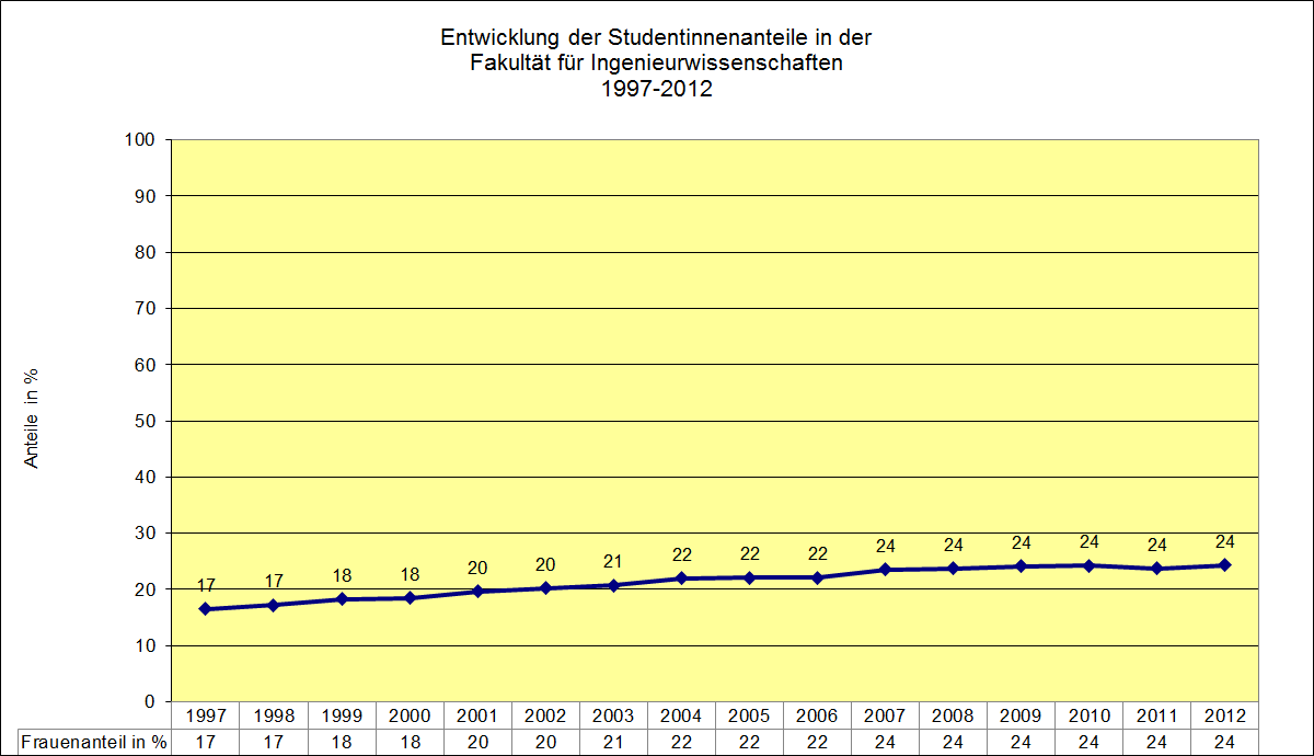 In dieser Fakultät gibt es steigende Studentinnenzahlen, wenn auch nicht so deutlich wie beispielsweise in der Mathematik oder in der Chemie. 17 Prozent Frauen waren 1997 in der Fakultät eingeschrieben, rund sieben Prozentpunkte mehr (24%) sind es seit 2009. Dies sind erfreuliche Zahlen für Akteurinnen und Akteure, denen an einer Steigerung der weiblichen Studierendenschaft in technikwissenschaftlichen Fächern gelegen ist. Ingenieurwissenschaften sind ein heterogenes Feld - der nächste Abschnitt zeigt, dass es Unterschiede in den jeweiligen Lehreinheiten dieser Fakultät hinsichtlich der der Studentinnenzahlen gibt. Die Graphik zeigt die Entwicklung der Studentinnenanteile in der Fakultät. Zur vergrößerten Ansicht bitte auf das Bild klicken.