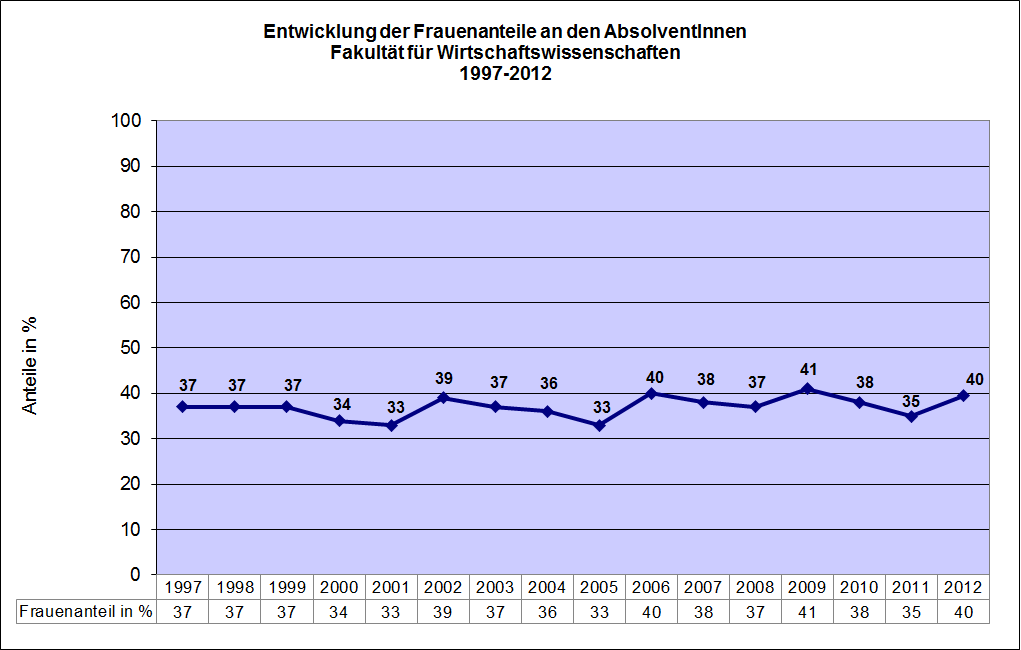 Der Anteil der weiblichen Graduierten in der wirtschaftswissenschaftlichen Fakultät schwankte in den Jahren 1997 und 2012 zwischen 33 und 41%. 2012 waren 40% der Graduierten dieser Fakultät weiblich. Die Graphik zeigt die Entwicklung der Absolventinnenanteile von 1997 bis 2011 für die gesamte Fakultät. Zur vergrößerten Ansicht bitte auf das Bild klicken.