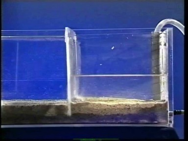 In Bildmitte befindet sich eine fixierte Wand, die unten im Sand einbindet aber nicht bis zum Boden des Behälters reicht. Auf der linken Seite steht das Wasser deutlich höher an als auf der rechten Seite. Es kommt daher zu einer Unterströmung der Wand. Das Wasser strömt von der linken Seite unter die Wand hindurch und steigt auf der rechten Seite durch den Boden wieder nach oben.