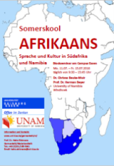 Vom 11.-15. Juli 2016 fand am Campus Essen zum ersten Mal eine Somerskool Afrikaans statt. Das Seminar beinhaltete einen Basis-Sprachkurs Afrikaans verbunden mit Grundlagenseminaren zu Kultur, Literatur, Landeskunde und Geschichte Südafrikas und Namibias. Der Unterricht verteilte sich auf 30 SWS, so dass die Veranstaltung für Studierende der geisteswissenschaftlichen Fakultät auch im E2-Bereich als Blockseminar mit 3 ECTS angekündigt war. Die Veranstaltung wurde von Herrn Prof. Dr. Heinz Eickmans organisiert und gehalten von Dr. Chrisna Beuke-Muir, Senior Lecturer Afrikaans, und Prof. Dr. Herman Beyer, Associate Professor Afrikaans an der University of Namibia in Windhoek. Für den Herbst ist ein Blockseminar für niederländische Sprachpraxis an der UNAM geplant. Dieses wird durch eine Dozentin der UDE vermittelt und beinhaltet Landeskunde der Niederlande und Flanderns.