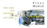 Im Wintersemester hat Klaus Modick vom 16.-20. November 2015 als Poet in Residence an der Universität Duisburg-Essen gelehrt. Modick wurde zuletzt für seinen Roman Konzert ohne Dichter von der Kritik euphorisch gepriesen und landete u.a. an der Spitze der SWR-Bestenliste. Mehr Informationen zu den Poetikvorlesungen von Klaus Modick und zur Schreibwerkstatt finden Sie auf unseren Poet-Seiten.
