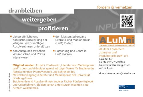 ALuMni. Fördernetz „Literatur und Medienpraxis LuM“ ist ein unabhängiger, gemeinnütziger Verein für Studierende, AbsolventInnen, Promovierende und Lehrende des Masterstudiengangs Literatur und Medienpraxis der Universität Duisburg-Essen. Wir freuen uns über Fördermitglieder sowie Unternehmen, welche sich mit den Zielen des Vereins identifizieren und sie unterstützen möchten.