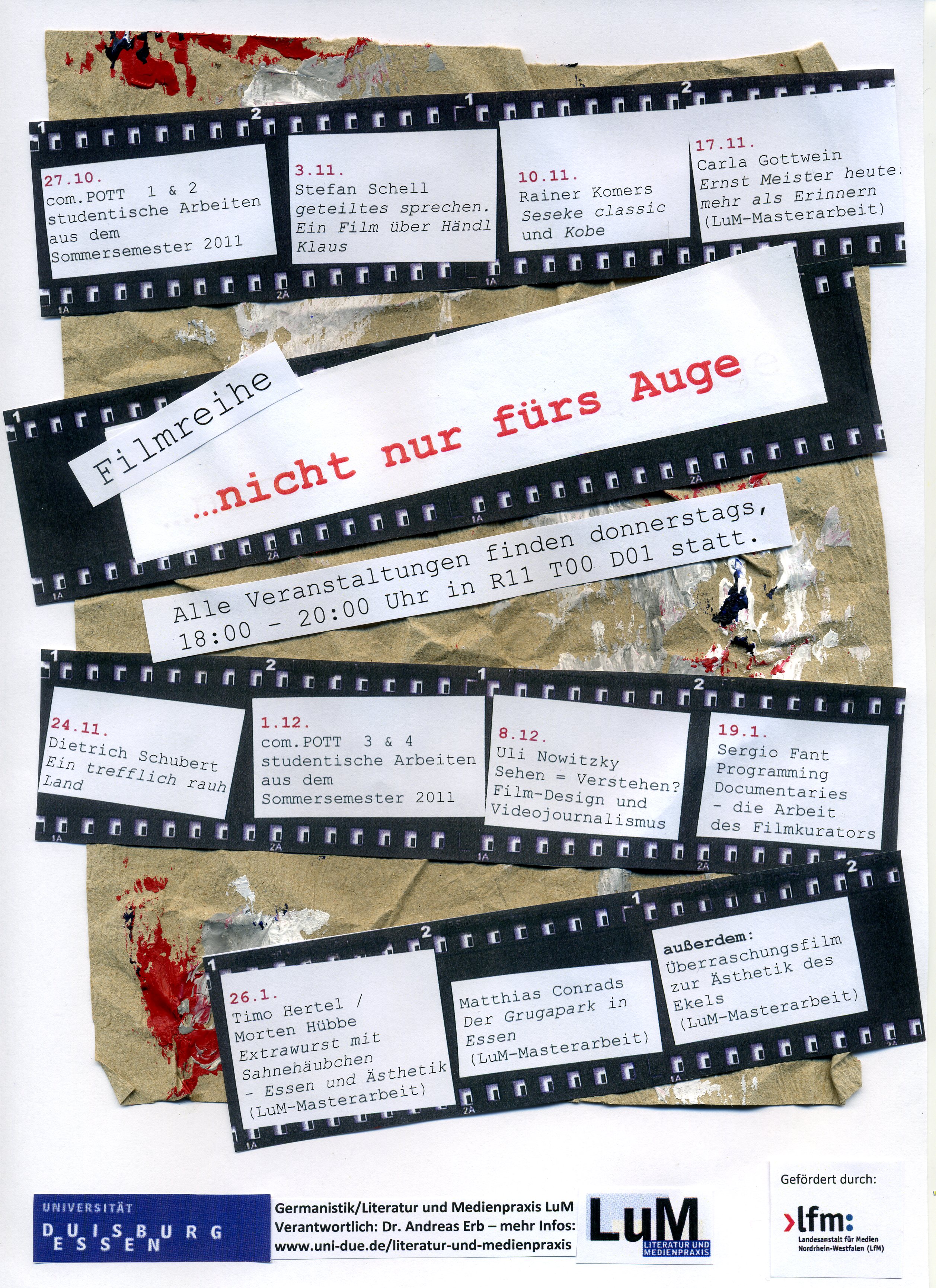 Wir freuen uns, dass wir unser Lehr- und Lernangebot erfolgreich erweitern konnten: Die Kommission der Landesanstalt für Medien in NRW (LfM) hat im Rahmen eines landesweiten Pilotprojektes im Wintersemester 2009/10 die Förderung eines Fernseh-Projektes für die Literatur und Medienpraxis an der Universität Duisburg-Essen übernommen - und sie für den im Wintersemester 2010/2011 beginnenden LuM-Jahrgang fortgesetzt. Wir hoffen, dass auch die nächsten LuM-Jahrgänge noch von diesem audiovisuellen Lehrprojekt profitieren können.