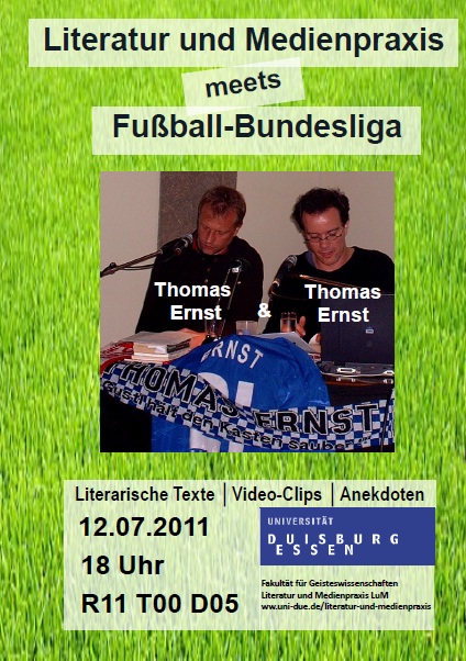 Die Veranstaltung findet am Dienstag, 12.7., um 18 Uhr, im Hörsaal R11 T00 D05 (Vorraum der UB) statt. Unser Dozent Thomas Ernst wird seinen Namensvetter, den langjährigen Bundesliga-Torwart Thomas Ernst, der zuletzt Manager des VfL Bochum war, als Gast begrüßen. Gemeinsam werden die beiden literarische Texte, Video-Clips, Anekdoten und Gespräche im Dreieck von Fußball, Literatur und Medien präsentieren. Mehr Informationen erhalten Sie auf der Webseite http://www.thomasernst.net/fussball.