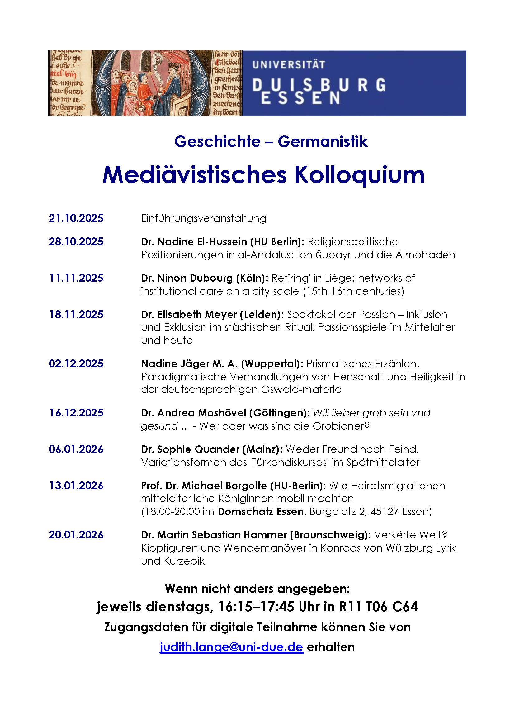 Das Mediävistische Kolloquium, das germanistische und historische Vorträge vereint, beginnt im Wintersemester 2025/26 am 21.10.2025.