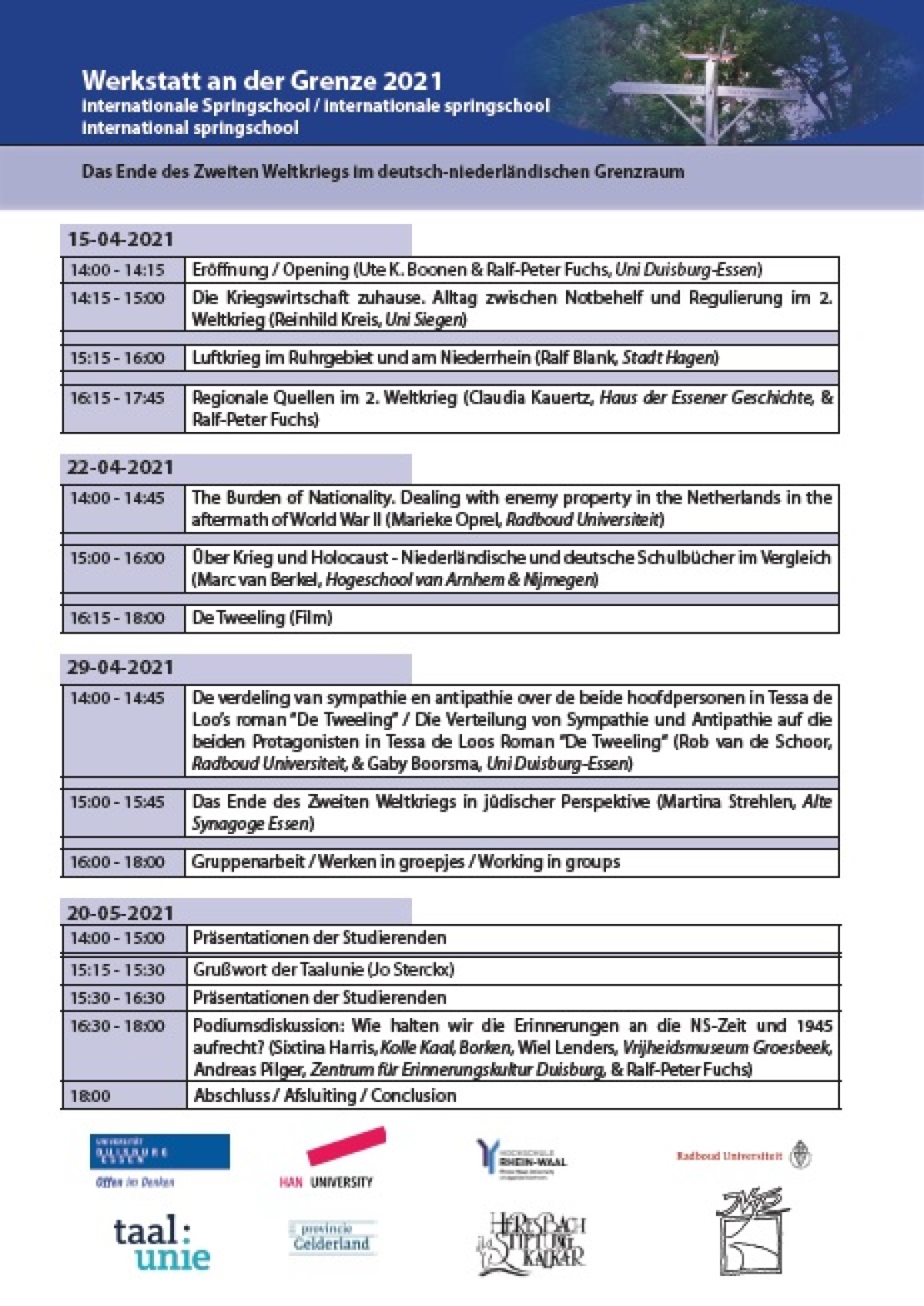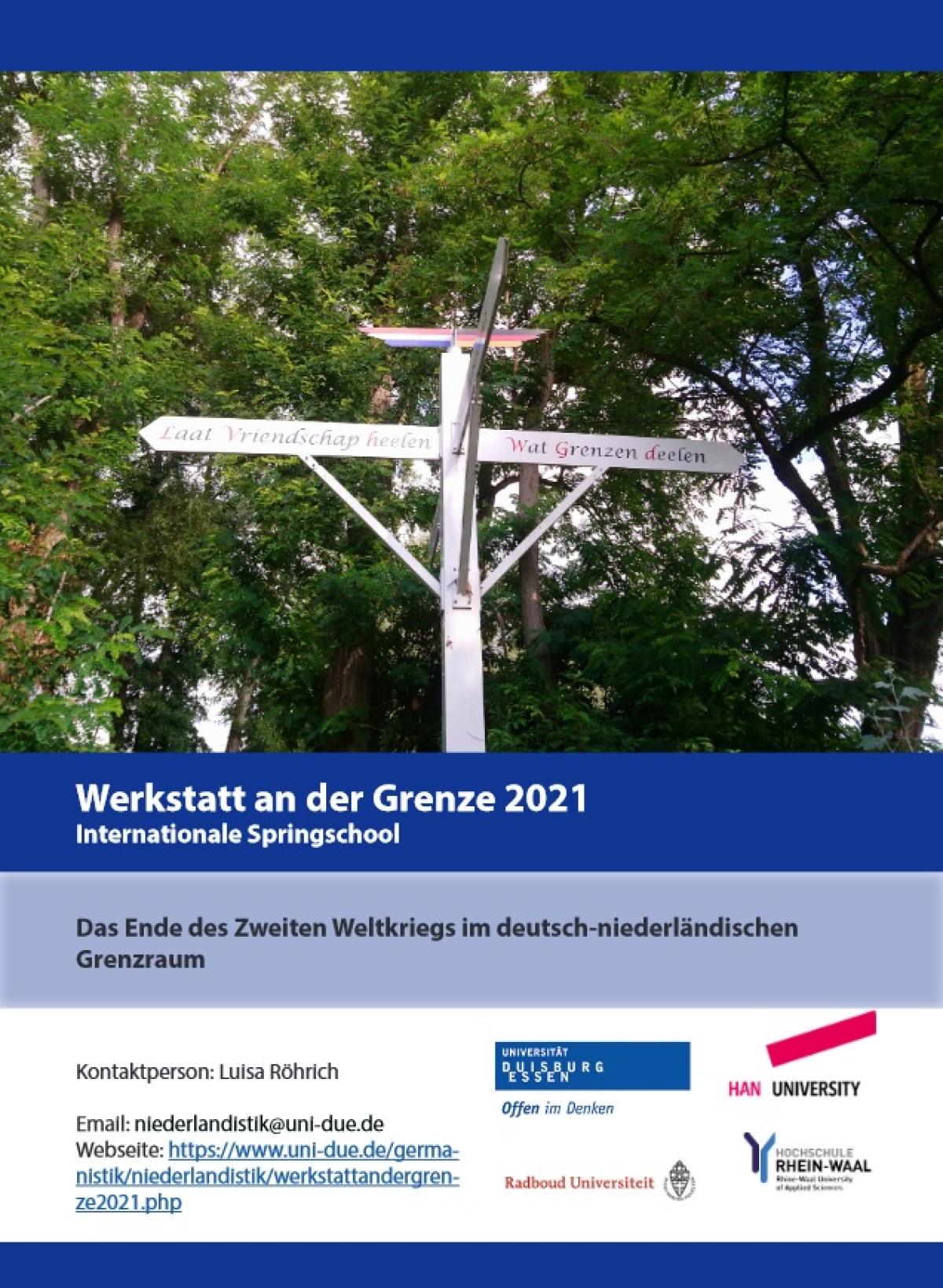 Studierende der teilnehmenden Hochschulen Universität Duisburg-Essen, Radboud Universiteit Nijmegen, Hogeschool Arnhem-Nijmegen und die Hochschule Rhein-Waal arbeiten in binationalen Tandems die neuere und neueste Geschichte der Grenzregion auf und setzen hierbei einen Schwerpunkt auf die Gemeinsamkeiten und Unterschiede in der Erinnerungskultur an den Zweiten Weltkrieg.
