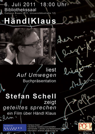 Der Filmemacher Stefan Schell begleitete Händl Klaus während der Poetik-Vorlesung, der Theateraufführung und der schriftstellerischen Schaffensphasen mit der Kamera. Der so entstandene Dokumentarfilm über Händl Klaus feierte in Essen im Juli 2011 Premiere.