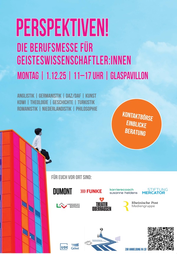Am 1.12.2025 findet im Glaspavillon (R12 S00 H12) am Campus Essen eine ganztägige Berufsmesse für alle Fach-Studierenden (BA und MA) der Geisteswissenschaften statt.