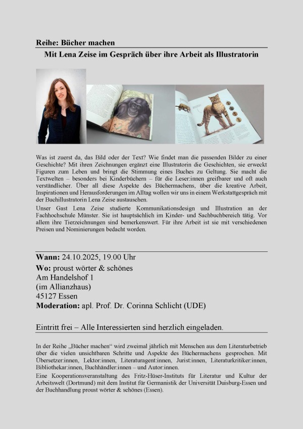 Was ist zuerst da, das Bild oder der Text? Wie findet man die passenden Bilder zu einer Geschichte? Mit ihren Zeichnungen ergänzt eine Illustratorin die Geschichten, sie erweckt Figuren zum Leben und bringt die Stimmung eines Buches zu Geltung. Sie macht die Textwelten – besonders bei Kinderbüchern – für die Leser:innen greifbarer und oft auch verständlicher. Über all diese Aspekte des Büchermachens, über die kreative Arbeit, Inspirationen und Herausforderungen im Alltag wollen wir uns in einem Werkstattgespräch mit der Buchillustratorin Lena Zeise austauschen.