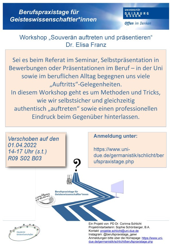 Die Berufspraxistage für Geisteswissenschaftler*innen richteten sich an alle Studierende in den Geisteswissenschaften (BA und MA, LA & Fach-Studiengänge). Das Ziel der Workshops und Infovorträge ist es, den Studierenden berufliche Orientierung zu geben. Berufsorientierung heißt auch, Studierende zu befähigen, sich für Weiterqualifikationen zu entscheiden, die einen späteren beruflichen Einstieg erst ermöglichen. Hierzu werden verschiedene Berufsfelder vorgestellt und konkrete Überblicke über spezifische Leistungsanforderungen gegeben, um eine frühzeitige Orientierung in Richtung Praktika, Studienschwerpunkte etc. zu geben. In den Workshops werden zudem auch konkrete Berufseinstiegsmöglichkeiten vorgestellt.