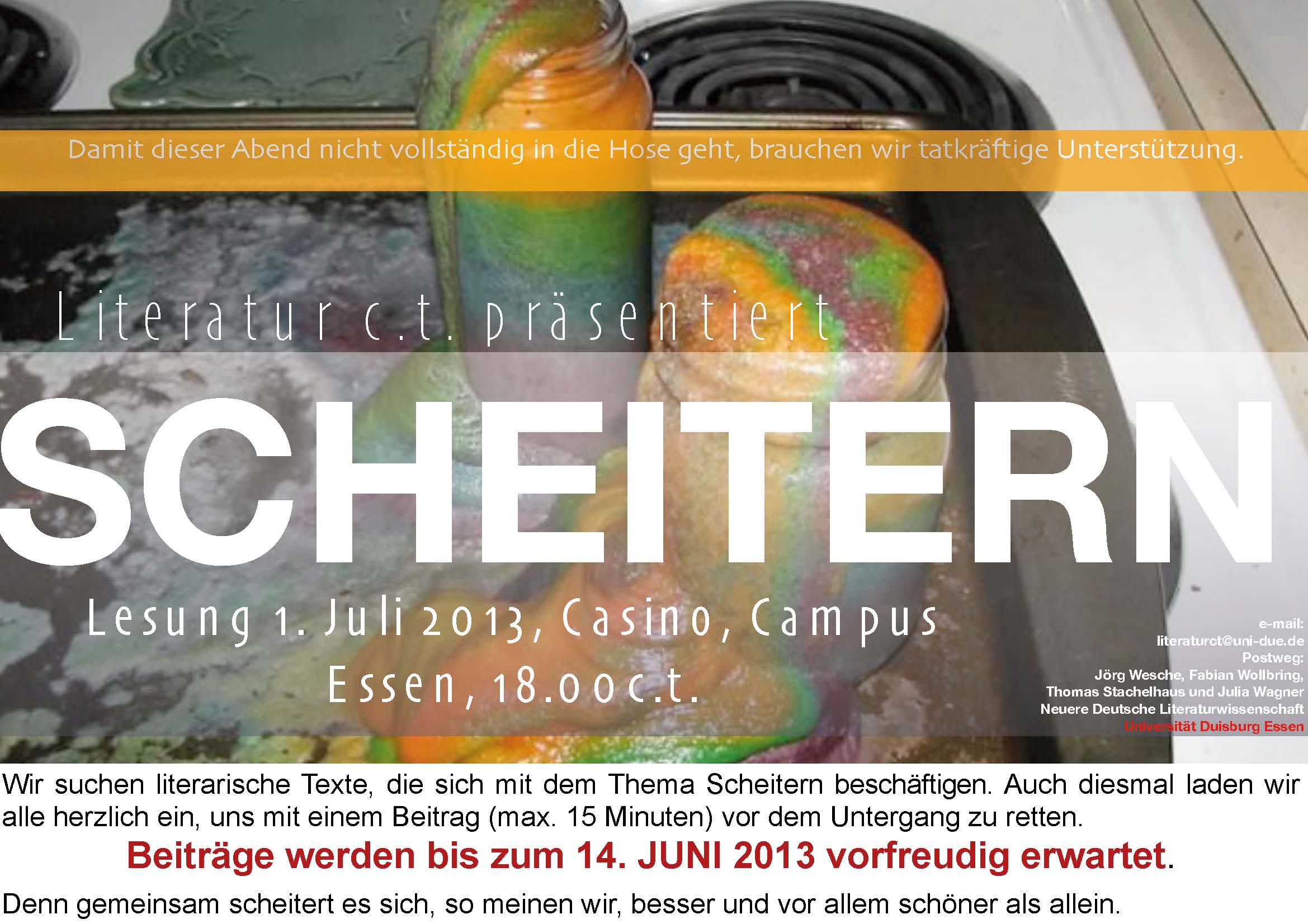 Der diessemestrige Literatur c.t.-Abend steht ganz unter dem (Vor-)Zeichen des Fehlschlags. Wir suchen literarische Texte, die sich mit dem Thema Scheitern beschäftigen. Auch diesmal laden wir alle herzlich ein, uns mit einem Beitrag (max. 15 Minuten) vor dem Untergang zu retten.