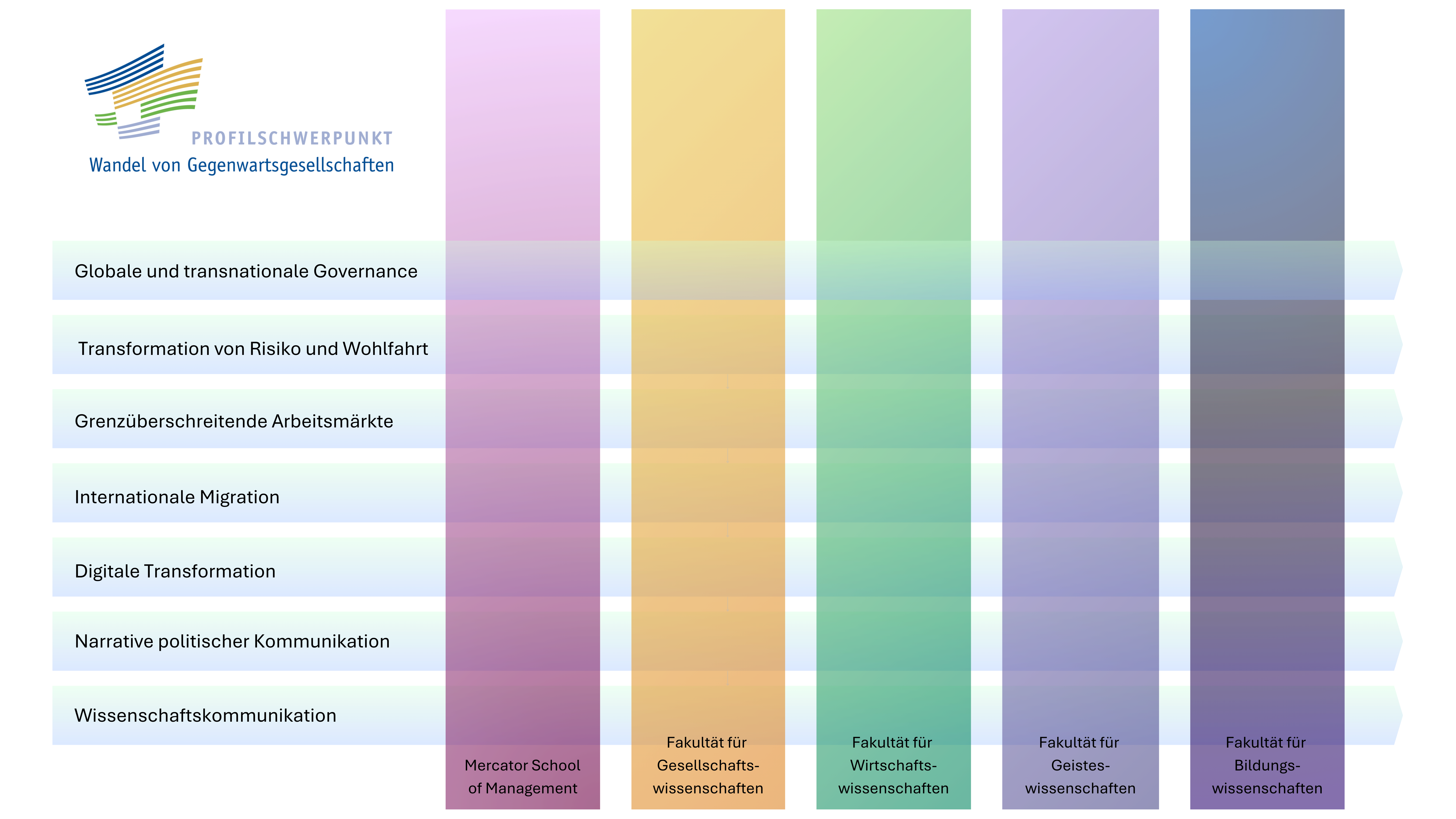Um dieses komplexe Wechselspiel zu analysieren, bündelt der Profilschwerpunkt die Expertise von rund 115 Mitgliedern. Diese stützen sich auf Forschungsstrukturen an fünf Fakultäten sowie ingesamt zehn zentralen wissenschaftlichen Einrichtungen und An-Instituten. Der Profilschwerpunkt verbindet zum einen sozial-, wirtschafts- und geistes- sowie bildungswissenschaftliche Einzeldisziplinen, zum anderen regionale und sektoriale Expertisen.