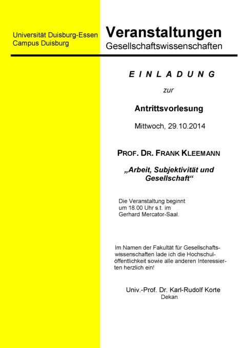 Prof. Dr. Frank Kleemann wird am Mittwoch, den 29. Oktober 2014 im Rahmes des Soziologischen Kolloquiums seine Antrittsvorlesung zum Thema „Arbeit, Subjektivität und Gesellschaft“ halten.