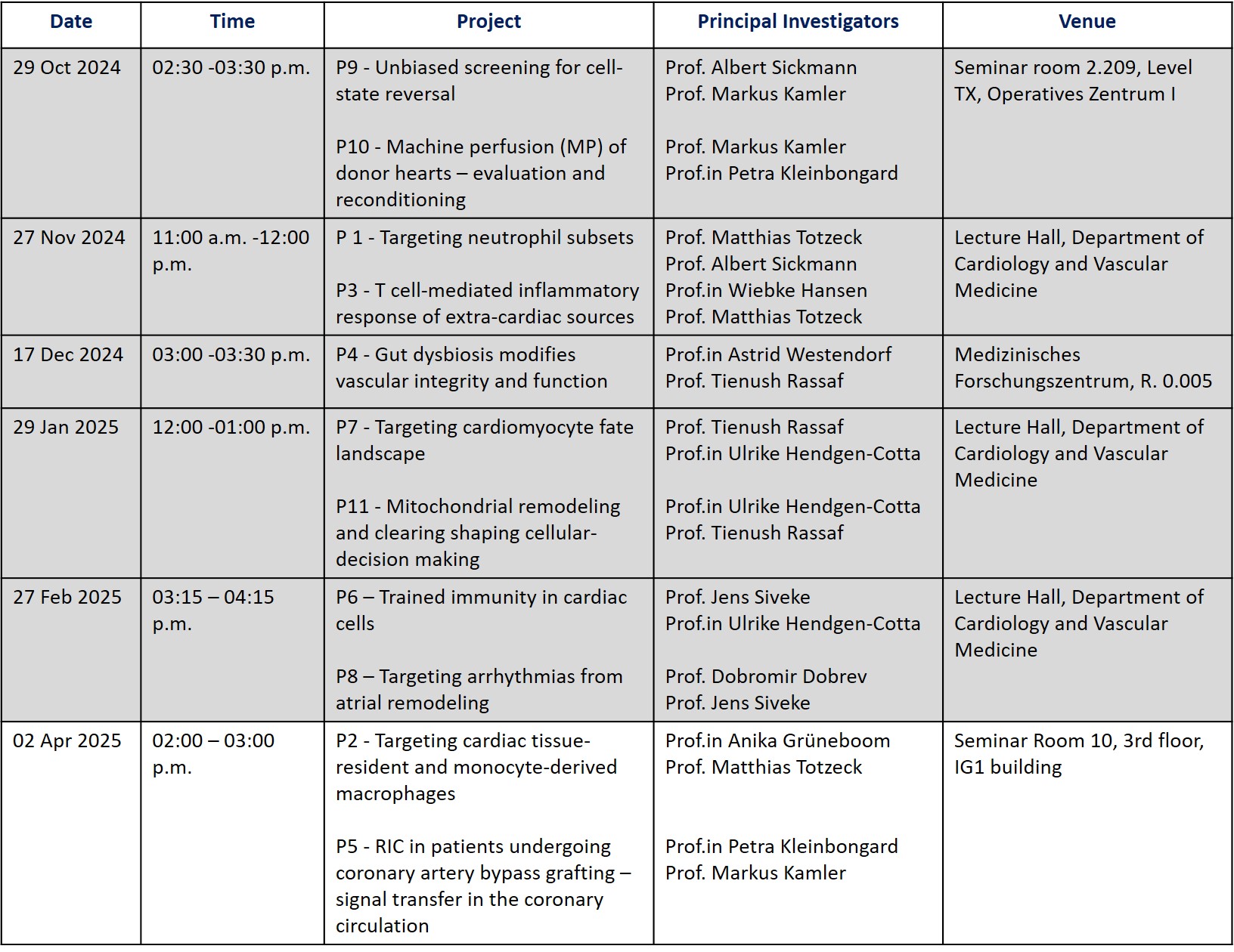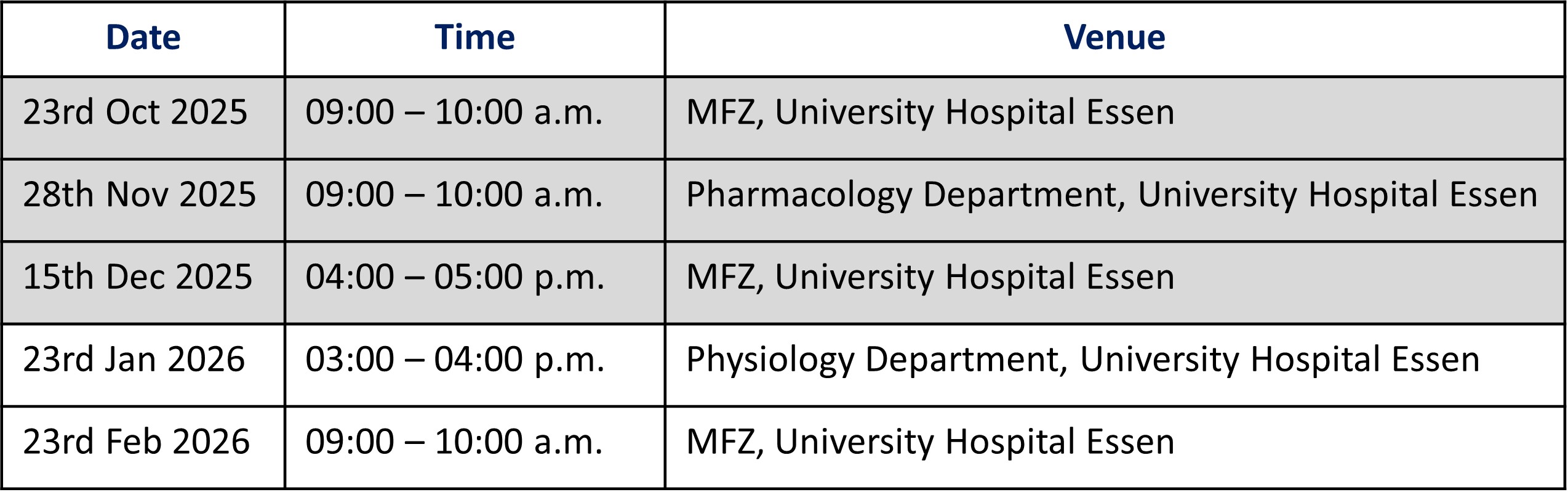 Main topic of our lecture series is „Cardiac Ischemia“. In different lectures scientific and medical basics of myocardial infarction as well as the background of the different research projects will be introduced. Lectures will take place on the campus of the University Hospital Essen. For the exact dates and venue of upcoming lectures, please refer to the table. The lecture is held in English.