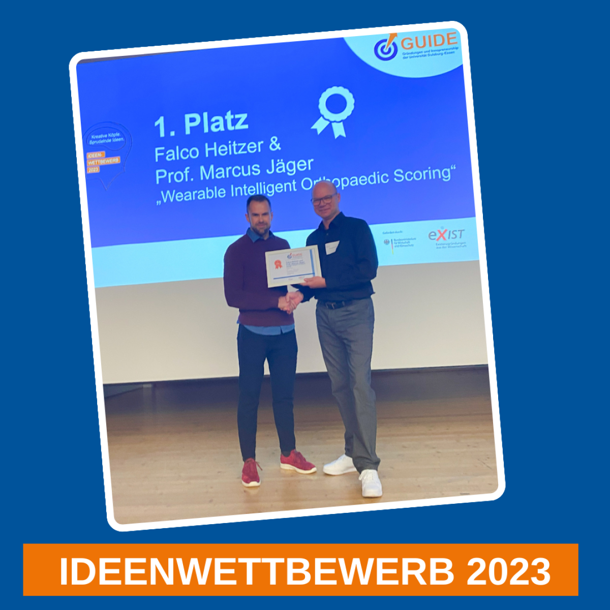 Platz 1 belegten Falko Heitzer und Prof. Dr. Marcus Jäger aus der Medizinischen Fakultät mit ihrer Idee „Wearable Intelligent Orthopaedic Scoring“. Ihre innovative Lösung soll die automatisierte Bewertung orthopädischer Patienten durch Messungen mit Wearables ermöglichen. Sie konnten sich neben Tickets zur Teilnahme an den Startup Olympics über ein individuelles Pitchtraining freuen.
