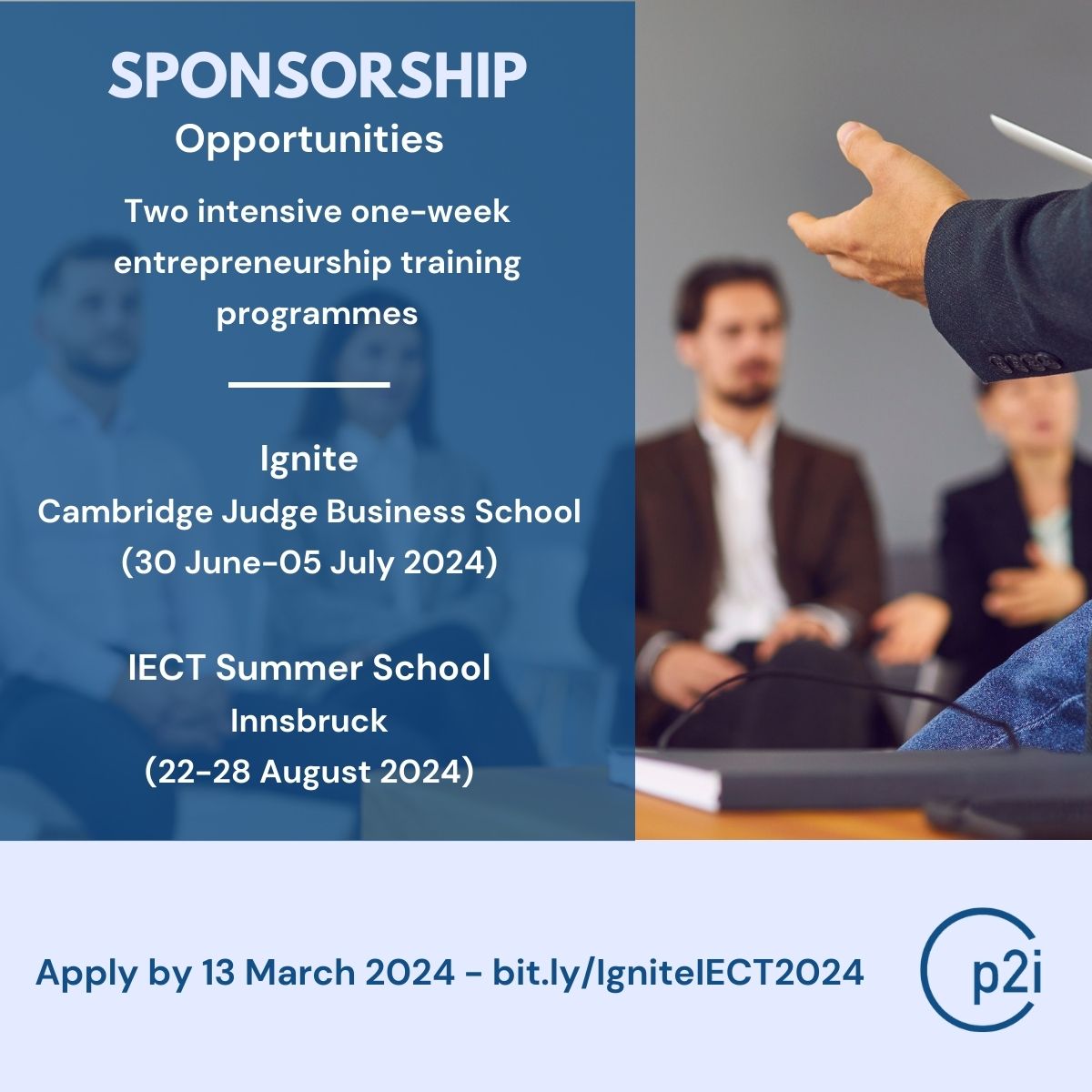 20.02.2024 Noch bis zum 13. März läuft die Bewerbungsfrist für die Teilnahme am Ignite-Programm (Cambridge Judge Business School, 30. Juni bis 5. Juli 2024) sowie die I.E.C.T. Summer School (Wattens, Innsbruck, Österreich, 22. bis 28. August 2024). Beide Programme richten sich an Forschende mit unternehmerischen Ambitionen, die eine entwickelte Geschäftsidee oder ein Frühphasenunternehmen in Technologie- oder Biowissenschaft haben.