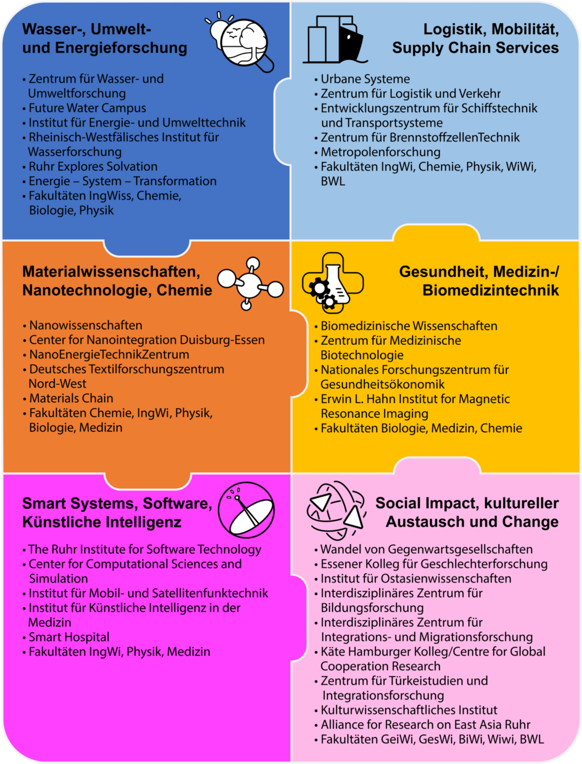 Gemeinsam mit regionalen Akteuren will die UDE neue Themenfelder erschließen und für Gründungen und Forschung nutzen. Die Basis hierfür bilden die Forschungsschwerpunkte und Einrichtungen, die in der Forschungsstrategie sowie im Hochschulentwicklungsplan der UDE verankert sind und einer Dynamisierung unterliegen.