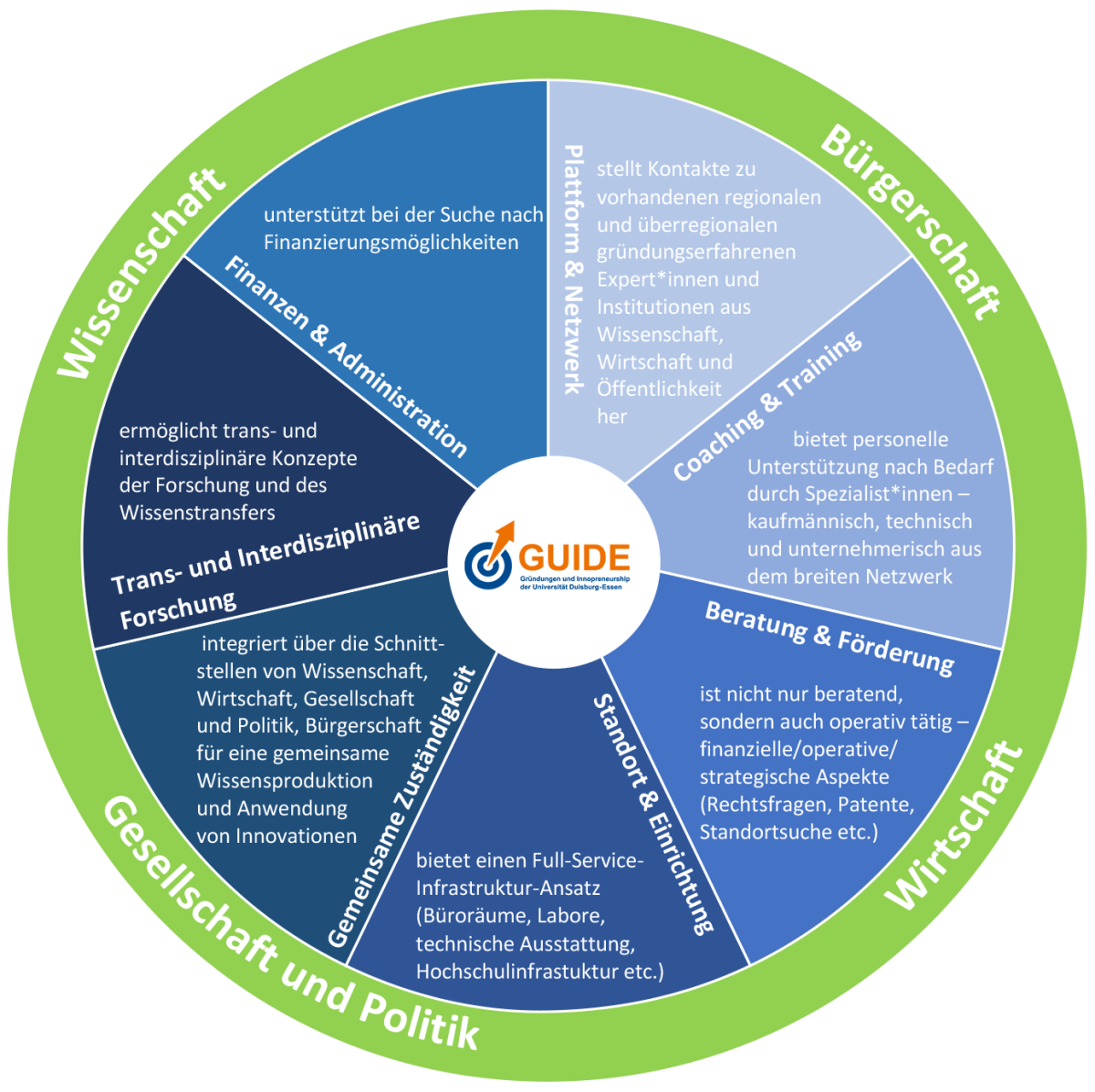 Aufbauend auf der Struktur, Größe und Expertise der UDE stellt GUIDE die Verbindung her zur inter- und transdisziplinären Forschung mit dem Ziel der Inkubation von forschungs- und technologiebasierten Ausgründungen.