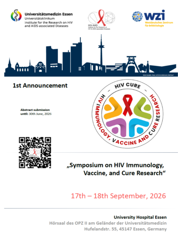 Das Institut für die Erforschung von HIV und AIDS-assoziierten Erkrankungen (HIV-AAD) des Universitätsklinikums Essen (UK Essen), unter der Leitung von Prof. Dr. Mirko Trilling und Prof. Dr. Stefan Esser, ist stolz, den dritten HIV-Workshop in Essen mit dem Titel "Symposium on HIV Immunology, Vaccine, and Cure Research" vom 17. bis 18. September 2026 auszurichten.