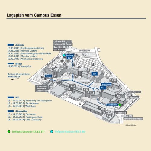 Fahren Sie ab Essen-Hbf mit den Straßenbahn-Linien 101 (Richtung Germaniaplatz) oder 105 (Richtung Frintrop-Unterstr.) zwei Stationen bis zur Haltestelle "Rheinischer Platz". Nehmen Sie dann den linken Ausgang in Richtung Universität und nach ca. 300 m erreichen Sie das Universitätsgelände.