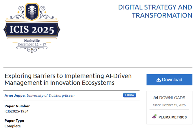 Der Artikel "Exploring Barriers to Implementing AI-Driven Management in Innovation Ecosystems" ist in den VHB A-gerankten Proceedings der International Conference on Information Systems (ICIS) 2025 erschienen.