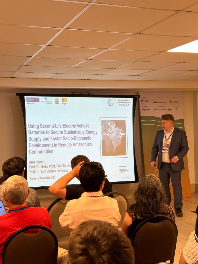 Arne Jeppe präsentierte dort die gemeinsame Forschung des deutsch-brasilianischen Teams zum Thema: "Using Second-Life Electric Vehicle Batteries to Secure Sustainable Energy Supply and Foster Socio-Economic Development in Remote Amazonian Communities".
