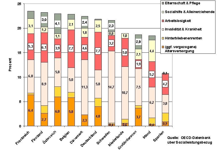 Privatdozent Dr. Matthias Knuth, Leiter der IAQ-Forschungsabteilung "Entwicklungstrends des Erwerbssystems", verglich die Anteile der Bevölkerung im Erwerbsalter, die in erster Linie von einer Sozialleistung und nicht von Erwerbsarbeit leben. Die skandinavischen Wohlfahrtsstaaten bilden dabei zusammen mit den kontinentalen eine buntgemischte Reihe von 23,5 Prozent (Frankreich) bis 21,6 Prozent (Schweden), Deutschland war im Jahr 2004 an vorletzter Stelle dieser Ländergruppe. Die "liberalen" Wohlfahrtsstaaten liegen mit Werten zwischen 19,0 und 18,5 Prozent nur wenig niedriger. Allein Spanien als einziger Repräsentant des "mediterranen" Typs, für den die OECD vergleichbare Daten verfügbar hat, fällt mit 10,8 Prozent deutlich nach unten ab.