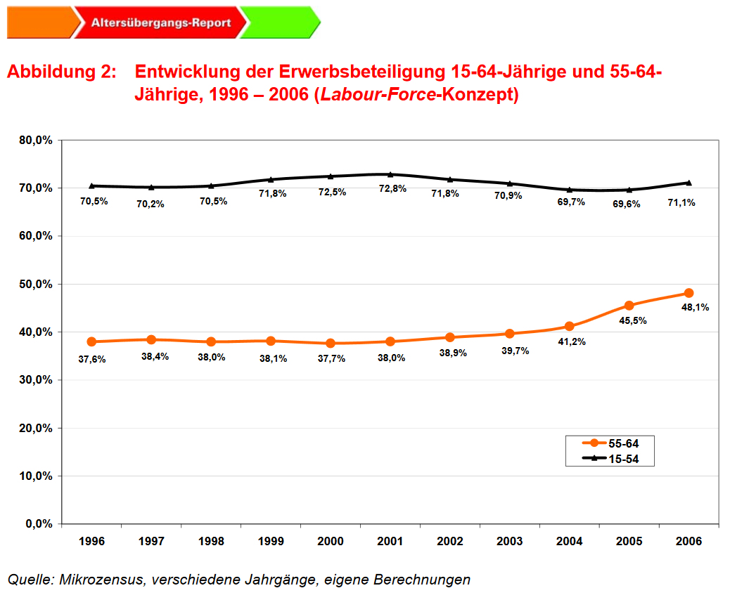 Wie der von der Hans-Böckler-Stiftung und dem Forschungsnetzwerk Alterssicherung geförderte IAQ-Altersübergangs-Monitor, berechnet auf Basis des Mikrozensus, zeigt, waren 2001 rund 11,2 Millionen Menschen zwischen 55 und 64 Jahre alt, 4,3 Millionen von ihnen erwerbstätig. 2006 gab es über eine Million weniger Personen in dieser Altersgruppe (9,8 Millionen), aber mehr Erwerbstätige (4,7 Millionen), so dass die Quote stieg. Die demografische Entwicklung wird nach den Berechnungen der IAQ-Wissenschaftler Dr. Martin Brussig und Sascha Wojtkowski weiter für etwa 15 Jahre die Entwicklung der Alterserwerbstätigenquote begünstigen.