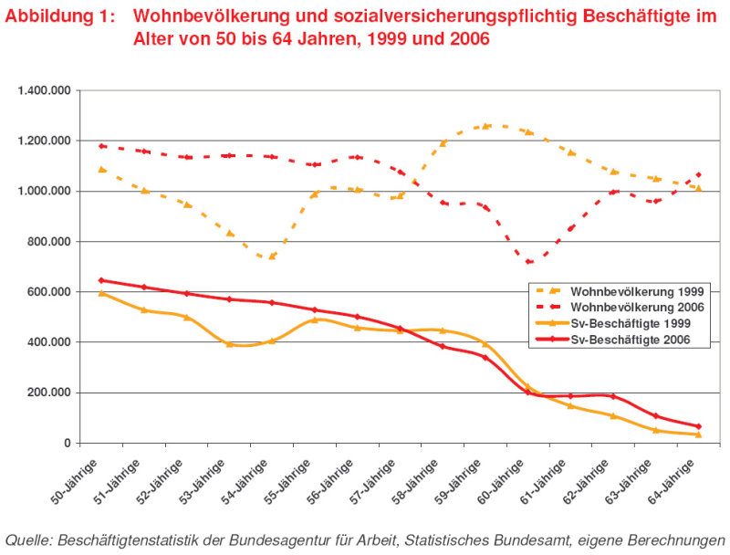 5,2 Millionen ältere Beschäftigte zwischen 50 und 64 Jahren gab es 1999, im Jahr 2006 waren es bereits 5,9 Millionen. Ebenfalls erhöht hat sich ihr Anteil an der Gesamtbeschäftigung. Er wuchs um fast 5 Prozentpunkte auf 22,7 Prozent. Gleichzeitig, so fanden die IAQ-Wissenschaftler Dr. Martin Brussig und Sascha Wojtkowski heraus, werden die alternden Belegschaften immer jünger: Mit den geburtenstarken Jahrgängen des Nachkriegs-Babybooms sind es vor allem die "jungen Alten", also die zwischen 50- und 54-Jährigen, die sie nun dominieren. Ihre Zahl unter den Beschäftigten legte zwischen 1999 und 2006 um ca. 560.000 Personen zu.