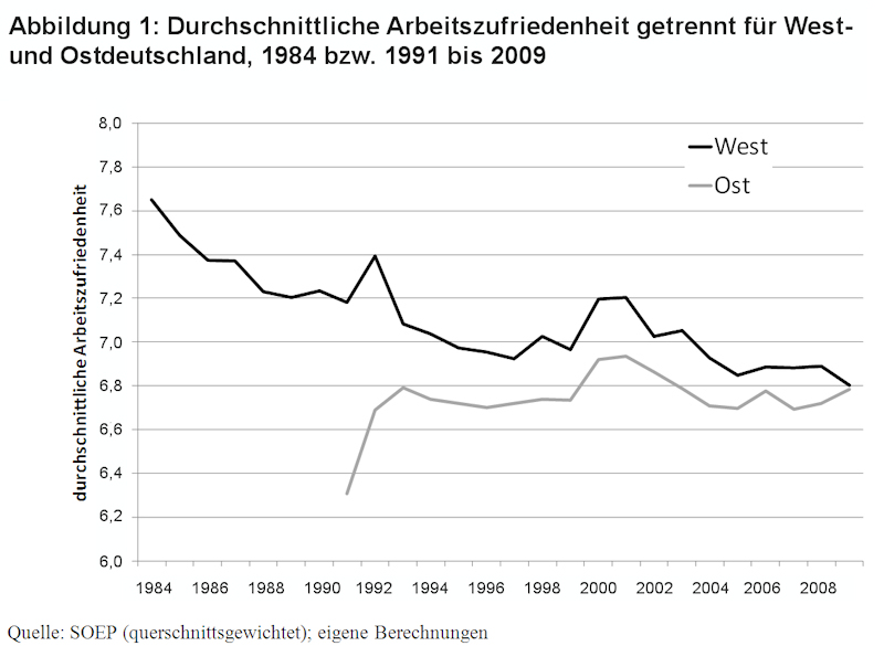 Prof. Dr. Marcel Erlinghagen, Friedrich Scheller und Yan Bohulskyy haben Daten aus der jährlichen Haushaltsbefragung des Sozio-Oekonomischen Panels von 1984 bis 2009 ausgewertet. Auf die Frage „Wie zufrieden sind Sie mit Ihrer Arbeit?” konnten die Befragten im Alter zwischen 20 und 64 Jahren auf der 11er Skala von „ganz und gar unzufrieden” bis „ganz und gar zufrieden” antworten.