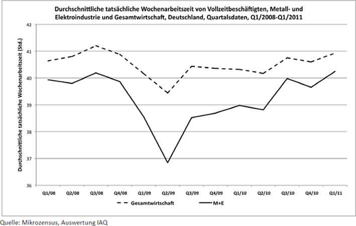 Mit der wirtschaftlichen Erholung wurden die Arbeitszeiten dann wieder länger. In der Metall- und Elektroindustrie ist das Ab und Auf besonders ausgeprägt. Dort gingen die Arbeitszeiten innerhalb weniger Monate um über drei Stunden zurück, doch bis zum 1. Quartal 2011 sind sie wieder auf das Vorkrisenniveau gestiegen. „Diese Arbeitszeitverlängerung geht weit über den Effekt des Abbaus der Kurzarbeit hinaus”, kommentiert IAQ-Arbeitszeitforscherin Christine Franz ihre Datenanalyse.